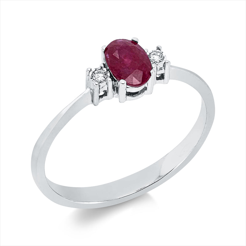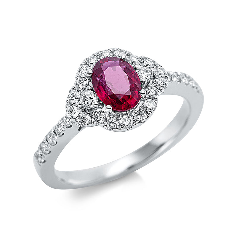 Ring 18 kt WG, 2 Brill. 0,06 ct, TW-vsi, 28 Brill. 0,38 ct, TW-vsi, 1 Rubin 0,86 ct rot
