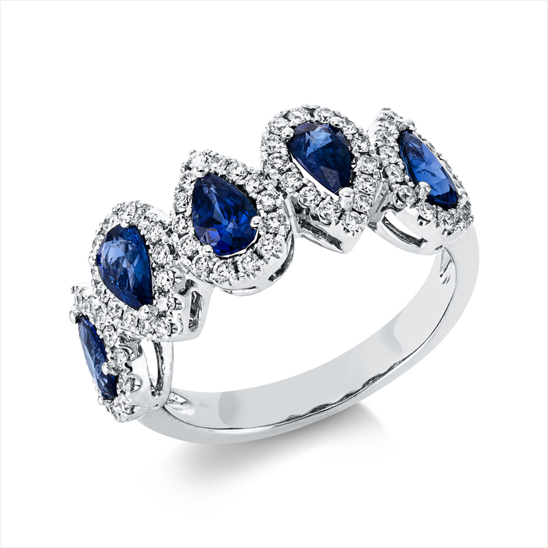 Ring 18 kt WG, 70 Brill. 0,43 ct, TW-si, 5 Saphire 1,38 ct blau