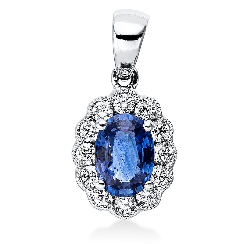 Anhänger 18 kt WG, mit Öse, 13 Brill. 0,35 ct, TW-si, 1 Saphir 0,85 ct blau