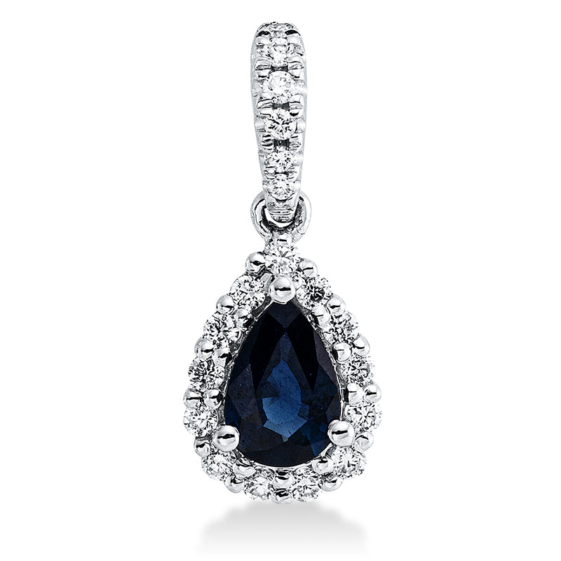 Anhänger 18 kt WG, mit Öse, 13 Brill. 0,14 ct, TW-si, 6 Brill. 0,03 ct, TW-si, 1 Saphir 0,42 ct blau