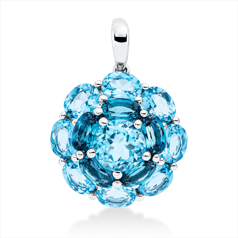 Anhänger 18 kt WG, mit Öse, 8 Topase 3,40 ct blau, 1 Topas 1,40 ct blau, 5 Topase 1,60 ct Lond. blue