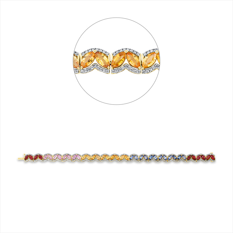 Armband 18 kt GG. 340 Brillanten 1.32 ct. W-pi. 40 Saphire 11.67 ct fancy. B:7.0 mm. L:17.8 cm