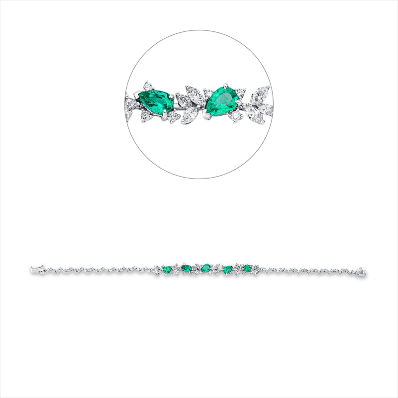 Armband 18 kt WG. 10 Navette 0.53 ct. TW-vsi/si. 8 Tropfen 0.63 ct. TW-vsi/si. 74 Brillanten 1.38 ct. TW-vsi/si. 5 Smaragde 1.62 ct grün. L:17.8 cm