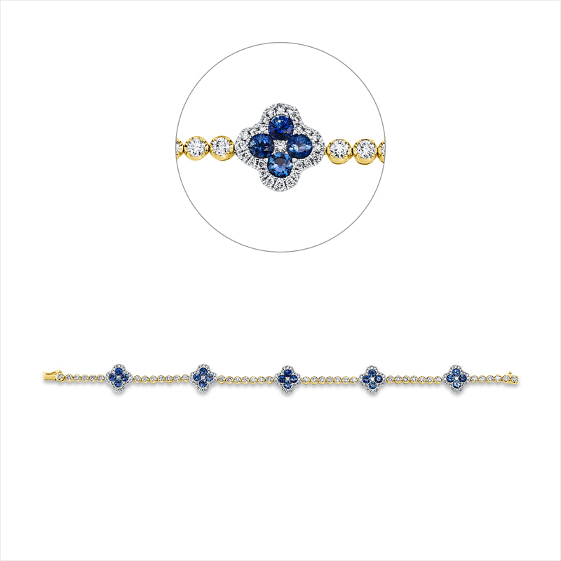Armband 18 kt GG. Fassung rhodiniert. 20 Brillanten 0.18 ct. TW-si. 45 Brillanten 2.03 ct. TW-si. 100 Brillanten 0.46 ct. TW-si. 20 Saphire 2.83 ct blau. L:17.8 cm