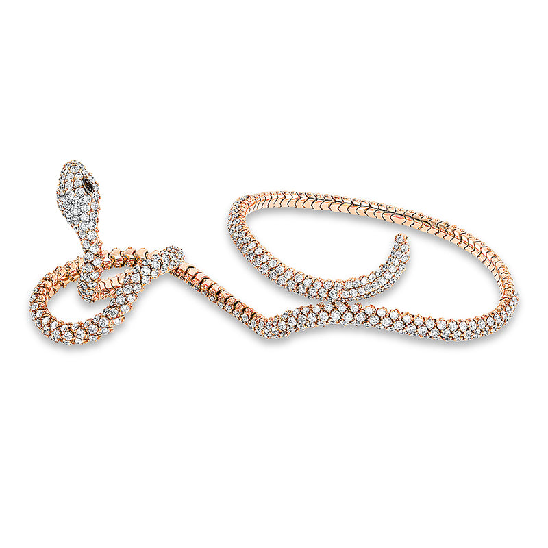 Armreif 18 kt RG Schlange. Fassung teils schwarz rhodinie. 383 Brillanten 8.66 ct. TW-vsi. 2 Tsavorith 0.05 ct grün. H:45.0 mm. B:55.0 mm