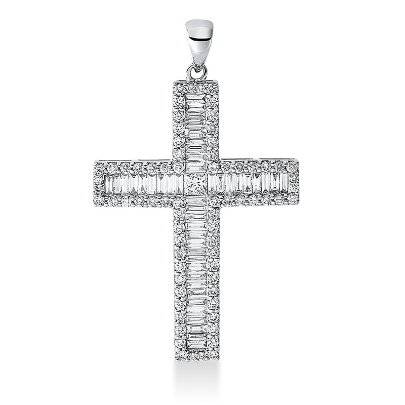 Anhänger 18 kt WG Kreuz. mit Öse. 43 Baguette 0.79 ct. W-si. 1 Princ. 0.15 ct. W-si. 72 Brillanten 0.81 ct. W-si