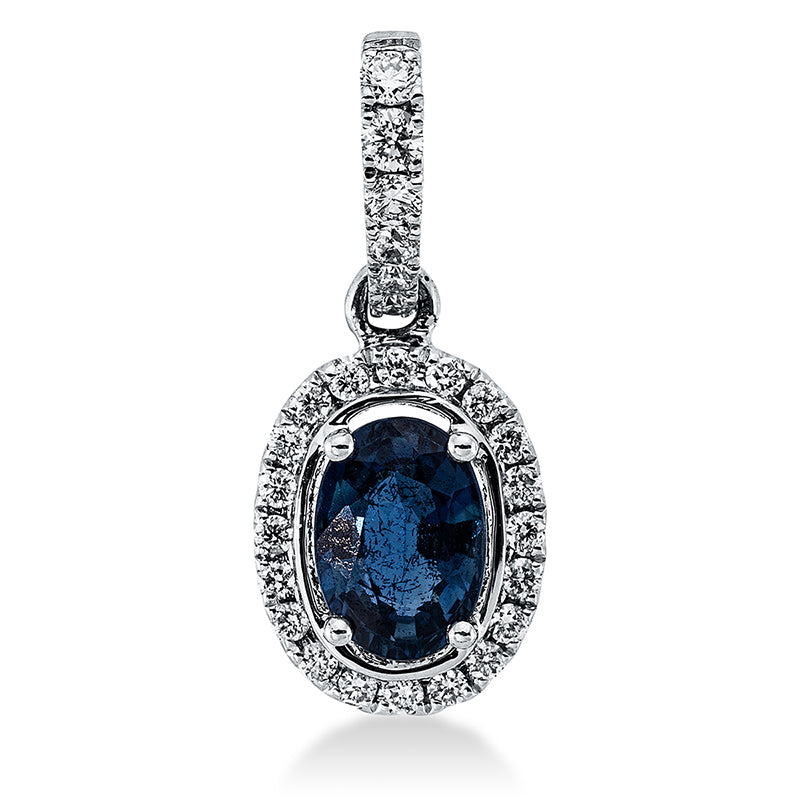 Anhänger 18 kt WG, mit Öse, 4 Brill. 0,05 ct, TW-si, 22 Brill. 0,10 ct, TW-si, 1 Saphir 0,76 ct blau