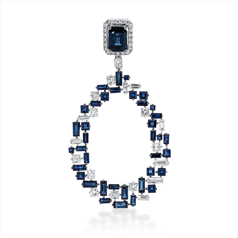Anhänger 18 kt WG. mit Öse. 11 Princ. 0.78 ct. F-vsi. 8 Baguette 0.35 ct. F-vsi. 22 Brillanten 0.18 ct. F-vsi. 38 Saphire 4.15 ct blau
