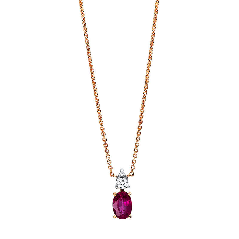 Collier 18 kt RG. 2 Brillanten 0.06 ct. TW-si. 1 Rubin 0.44 ct rot. H:10.2 mm. B:3.8 mm. S:2.6 mm