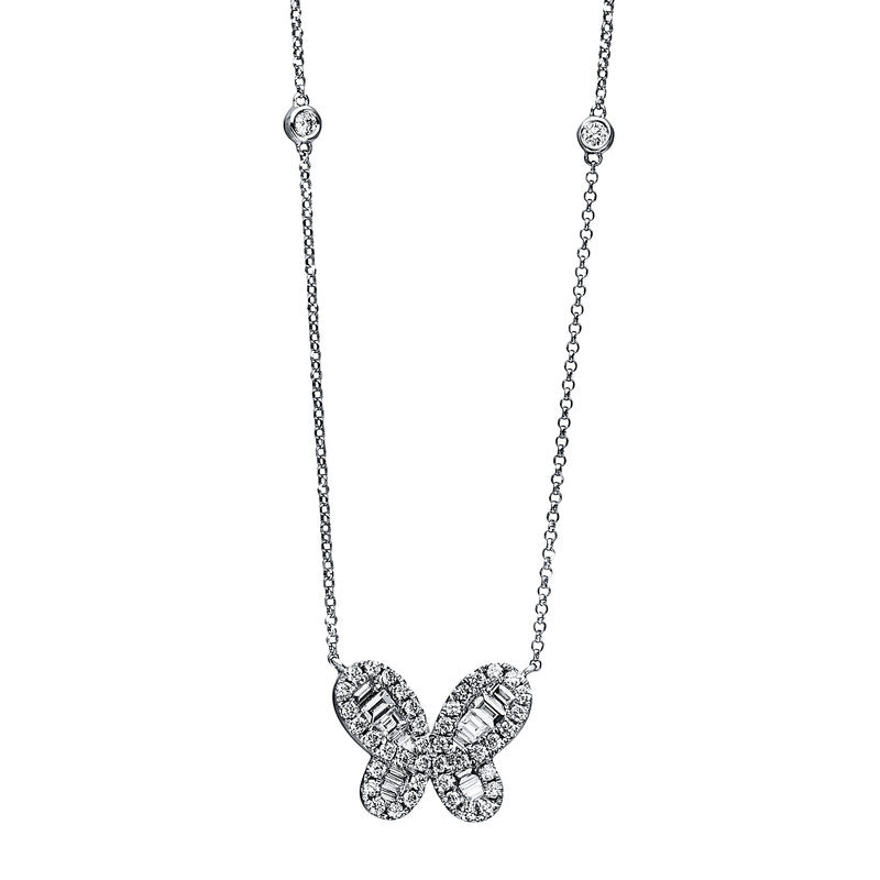 Collier 18 kt WG Schmetterling. mit ZÖ 38.1 cm + 40.6 cm. 16 Baguette 0.27 ct. TW-si. 44 Brillanten 0.46 ct. TW-si. L:43.0 cm