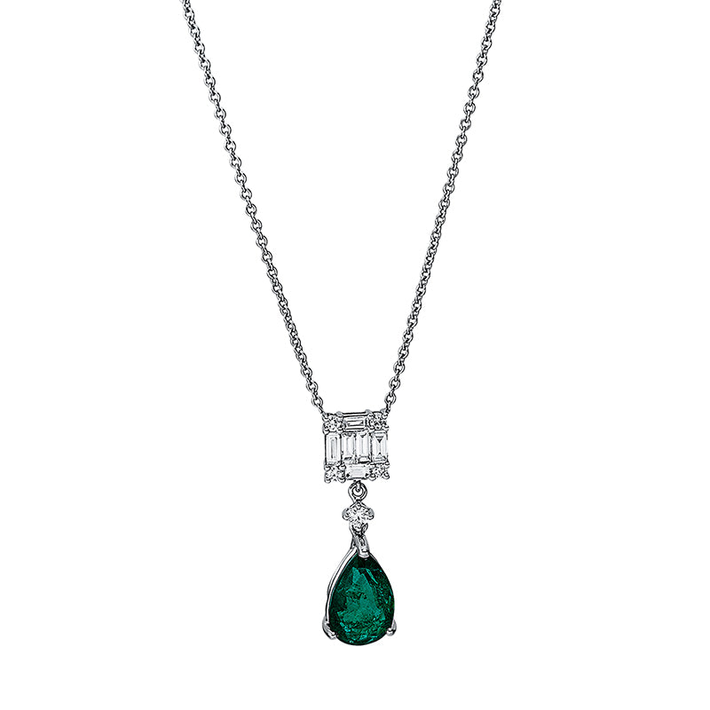 Collier 18 kt WG, mit ZÖ 40 cm, 6 Bag. 0,35 ct, TW-si, 5 Brill. 0,12 ct, TW-si, 1 Smaragd 2,19 ct grün