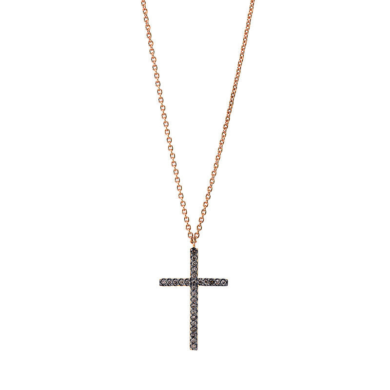 Collier 18 kt RG Kreuz. Fassung teils schwarz rhodinie. 27 Brillanten 0.08 ct. braun-si. H:19.9 mm. B:11.9 mm. L:42.0 cm. S:1.3 mm
