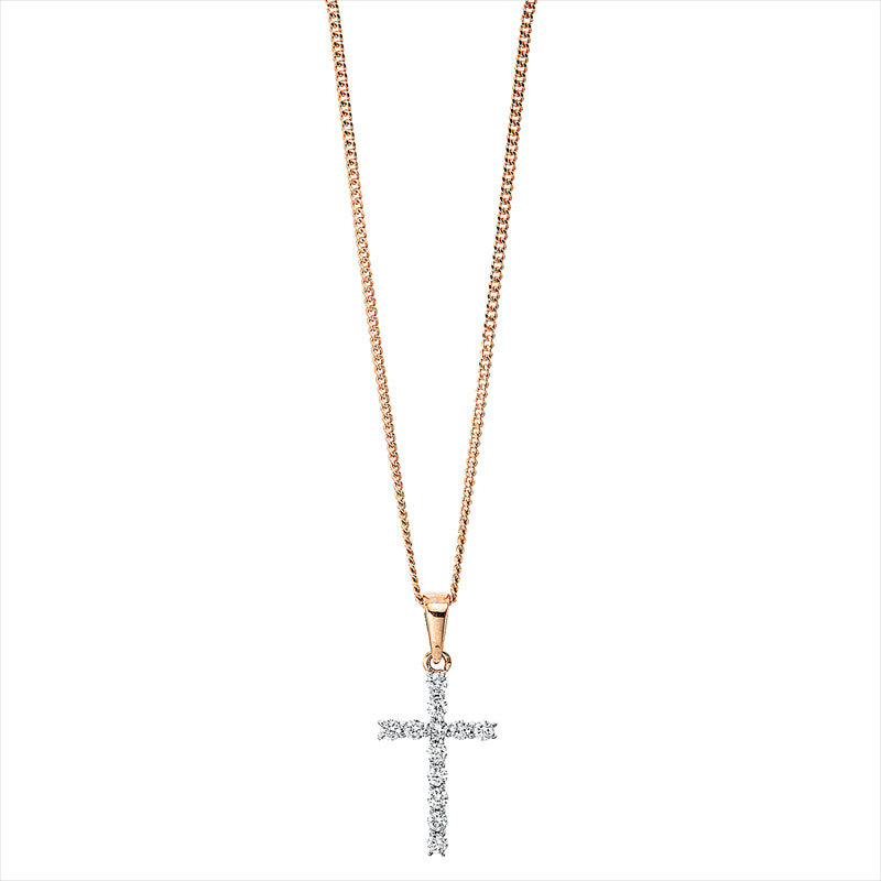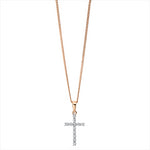 Collier 18 kt RG Kreuz. Fassung rhodiniert. 12 Brillanten 0.15 ct. TW-si. H:24.5 mm. B:12.7 mm. L:43.0 cm. S:2.5 mm