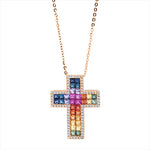 Collier 18 kt RG Kreuz. 80 Brillanten 0.31 ct. TW-si. 34 Saphire 1.96 ct fancy. H:25.3 mm. B:19.1 mm. L:42.0 cm. S:2.8 mm