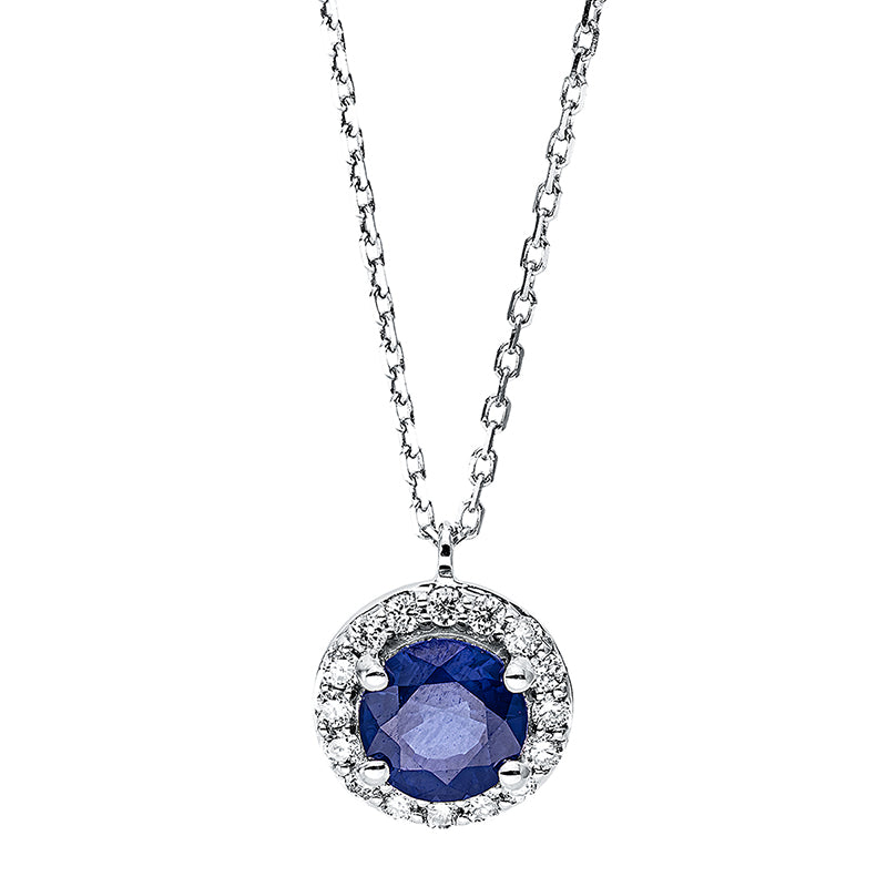 Collier 18 kt WG, mit ZÖ 40 cm + 42 cm, 16 Brill. 0,11 ct, TW-si, 1 Saphir 0,60 ct blau