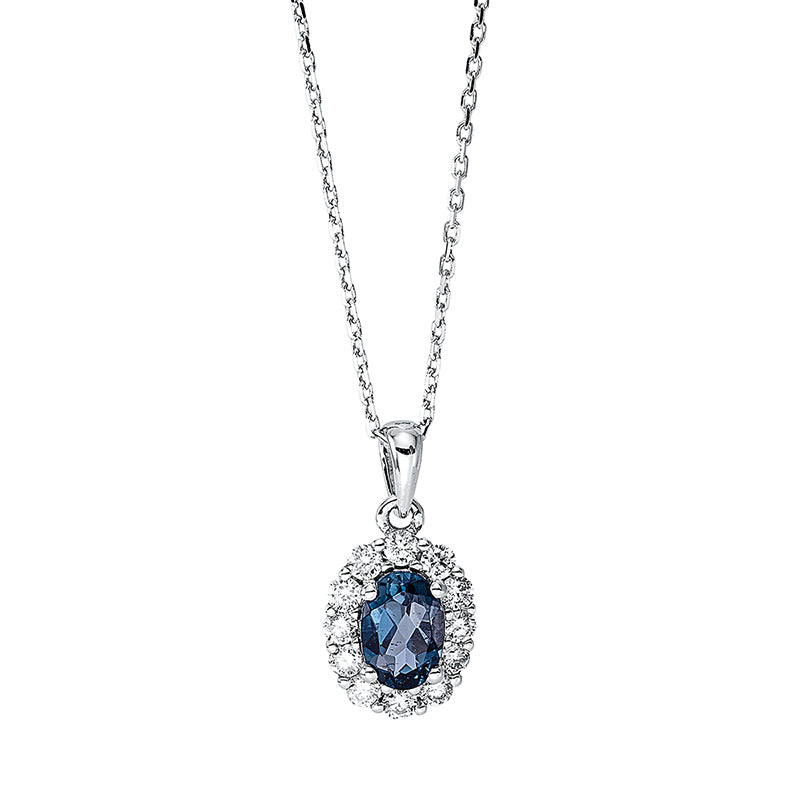 Collier 18 kt WG. mit ZÖ 40 cm + 42 cm. 6 Brillanten 0.14 ct. TW-si. 6 Brillanten 0.11 ct. TW-si. 1 Topas 0.58 ct Lond. blue. H:15.0 mm. B:7.4 mm. L:45.0 cm. S:4.6 mm