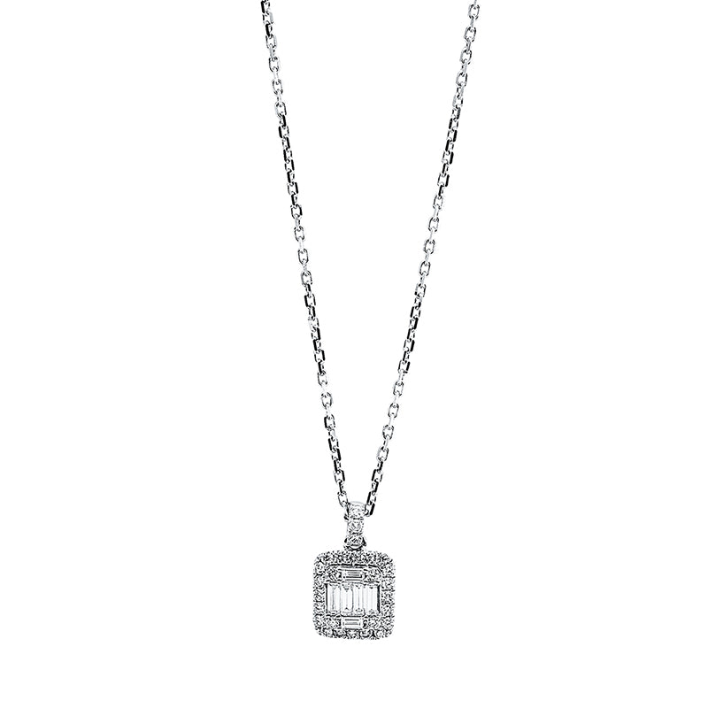 Collier 18 kt WG. mit ZÖ 40 cm + 43 cm. 6 Baguette 0.17 ct. TW-si. 27 Brillanten 0.18 ct. TW-si. L:45.7 cm