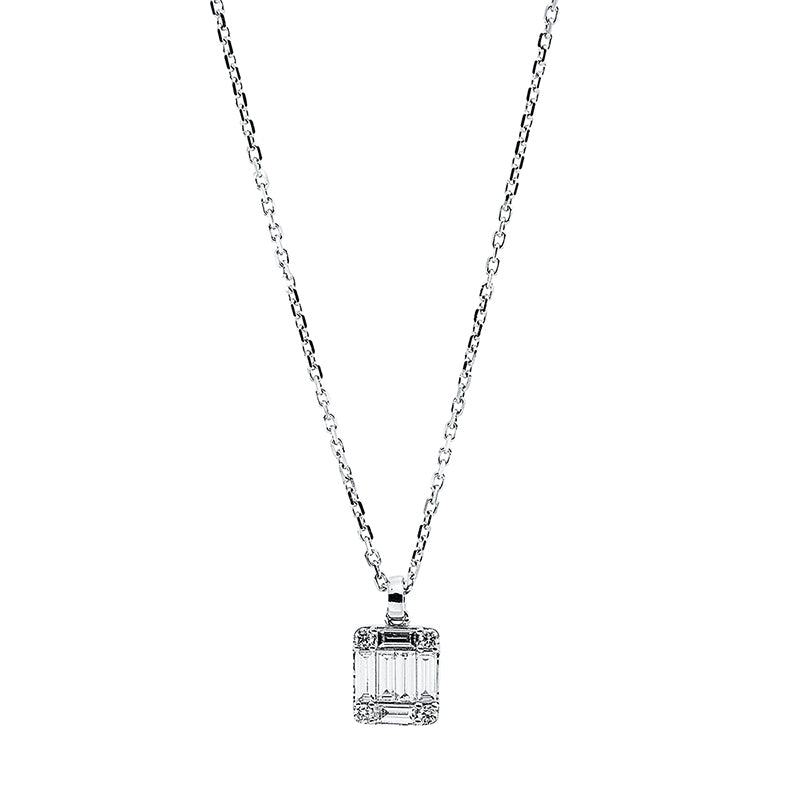 Collier 18 kt WG. mit ZÖ 40 cm + 43 cm. 6 Baguette 0.39 ct. TW-si. 4 Brillanten 0.06 ct. TW-si. H:11.7 mm. B:6.8 mm. L:45.7 cm. S:2.6 mm