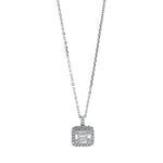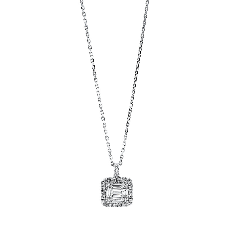Collier 18 kt WG. mit ZÖ 40 cm + 43 cm. 4 Brillanten 0.05 ct. TW-si. 6 Baguette 0.30 ct. TW-si. 25 Brillanten 0.19 ct. TW-si. H:13.9 mm. B:10.1 mm. L:45.7 cm. S:4.3 mm
