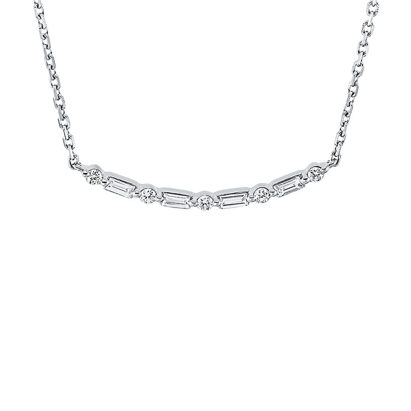 Collier 18 kt WG. mit ZÖ 40 cm + 43 cm. 4 Baguette 0.16 ct. TW-si. 5 Brillanten 0.11 ct. TW-si. L:45.7 cm