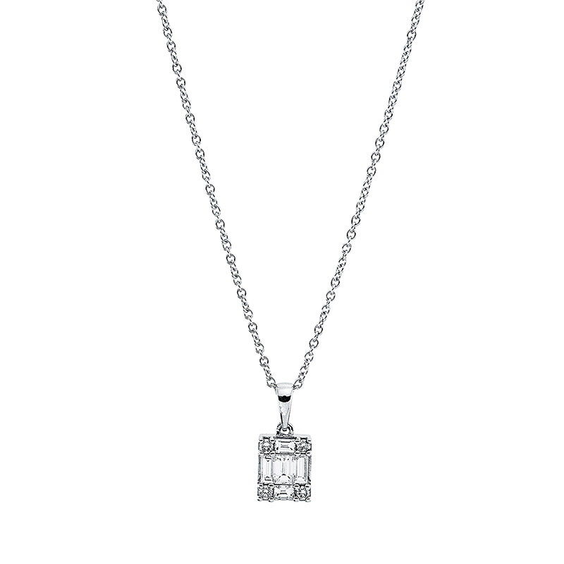 Collier 18 kt WG. mit ZÖ 42 cm. 2 Baguette 0.11 ct. TW-si. 3 Baguette 0.26 ct. TW-si. 4 Brillanten 0.07 ct. TW-si. H:13.7 mm. B:6.0 mm. L:45.0 cm. S:2.4 mm