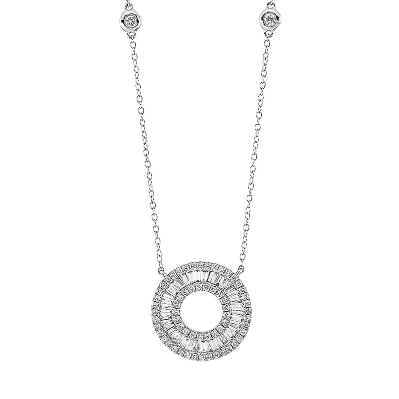 Collier 18 kt WG, mit ZÖ 38 cm + 41 cm, 28 Trap. 0,35 ct, TW-si, 9 Bag. 0,13 ct, TW-si, 63 Brill. 0,34 ct, TW-si