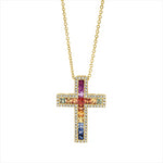 Collier 18 kt GG Kreuz. mit ZÖ 40 cm. 72 Brillanten 0.21 ct. TW-si. 16 Saphire 0.99 ct fancy. H:22.8 mm. B:16.8 mm. L:45.0 cm. S:3.3 mm