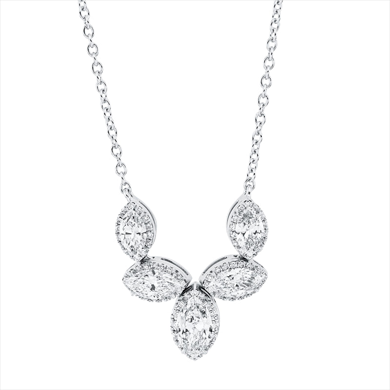 Collier 18 kt WG. mit ZÖ 38cm&40.6cm&43.2cm. 5 Navette 0.96 ct. TW-si. 76 Brillanten 0.15 ct. TW-si. L:45.7 cm