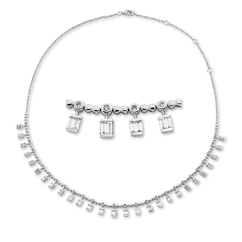 Collier 18 kt WG, mit ZÖ 35,5 cm + 38 + 40,6 cm, 54 Bag. 1,81 ct, TW-vsi, 27 Brill. 0,44 ct, TW-vsi/si