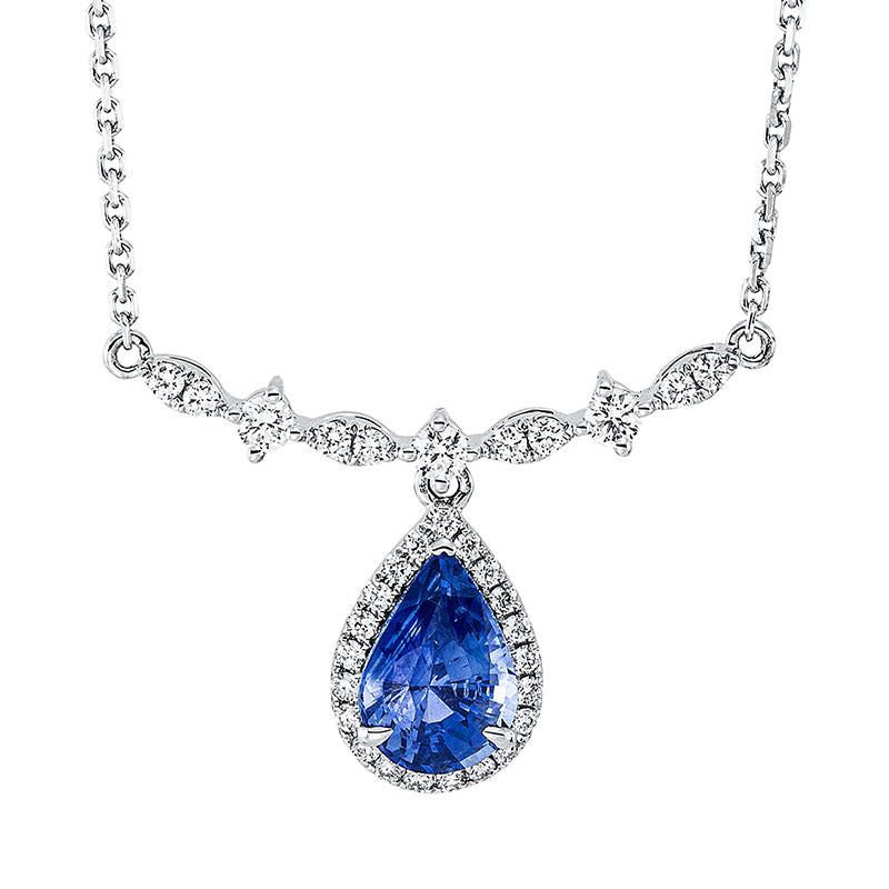 Collier 18 kt WG, 3 Brill. 0,12 ct, TW-si, 29 Brill. 0,19 ct, TW-si, 1 Saphir 1,67 ct blau
