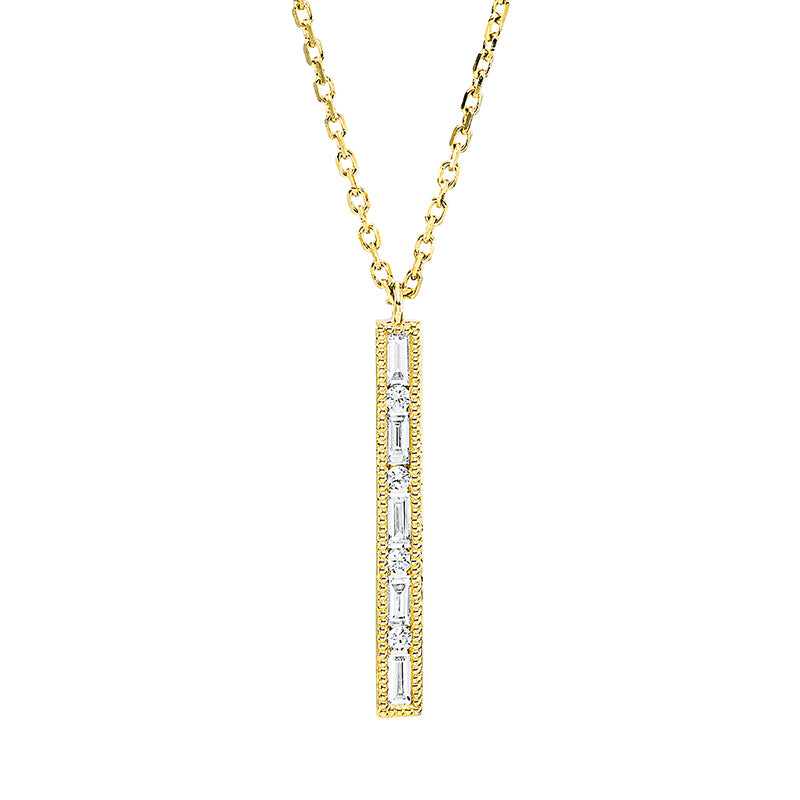 Collier 18 kt GG. mit ZÖ 40 cm + 43 cm. 5 Baguette 0.19 ct. TW-si. 4 Brillanten 0.05 ct. TW-si. H:24.0 mm. B:2.6 mm. L:45.7 cm. S:1.7 mm