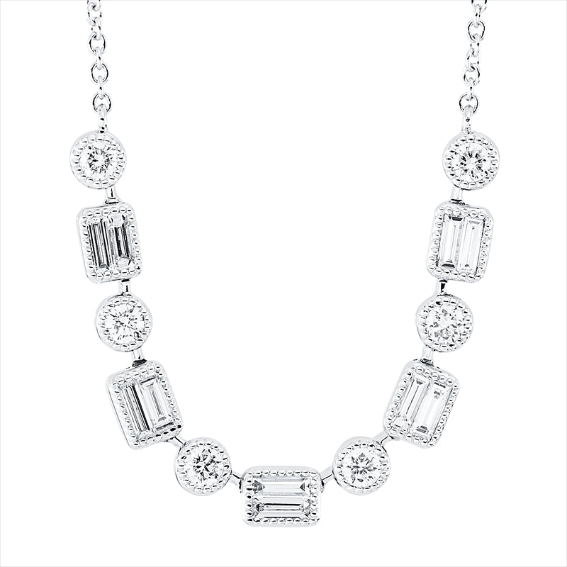Collier 18 kt WG. mit ZÖ 40 cm + 43 cm. 10 Baguette 0.32 ct. TW-si. 6 Brillanten 0.28 ct. TW-si. L:45.7 cm