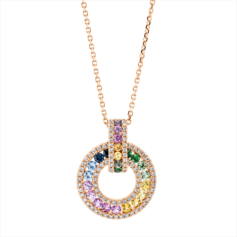 Collier 18 kt RG. mit ZÖ 42 cm & 43.5 cm. 87 Brillanten 0.60 ct. TW-si. 3 Tsavorith 0.21 ct grün. 21 Saphire 1.52 ct multicolor. L:45.0 cm