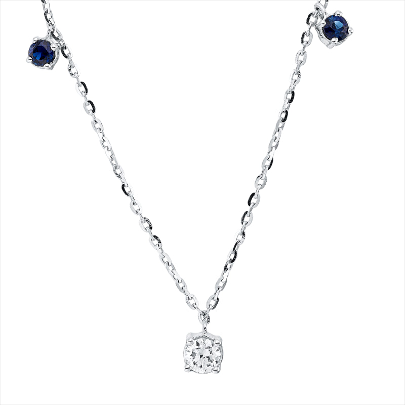 Collier 18 kt WG, mit ZÖ 40 cm + 43 cm, 1 Brill. 0,08 ct, TW-si, 6 Saphire 0,22 ct blau