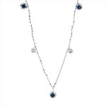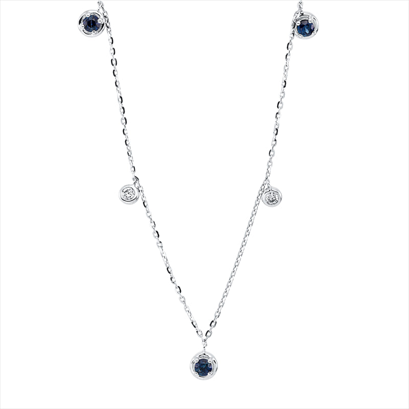 Collier 18 kt WG, mit ZÖ 40 cm + 43 cm, 4 Brill. 0,11 ct, TW-si, 3 Saphire 0,22 ct blau