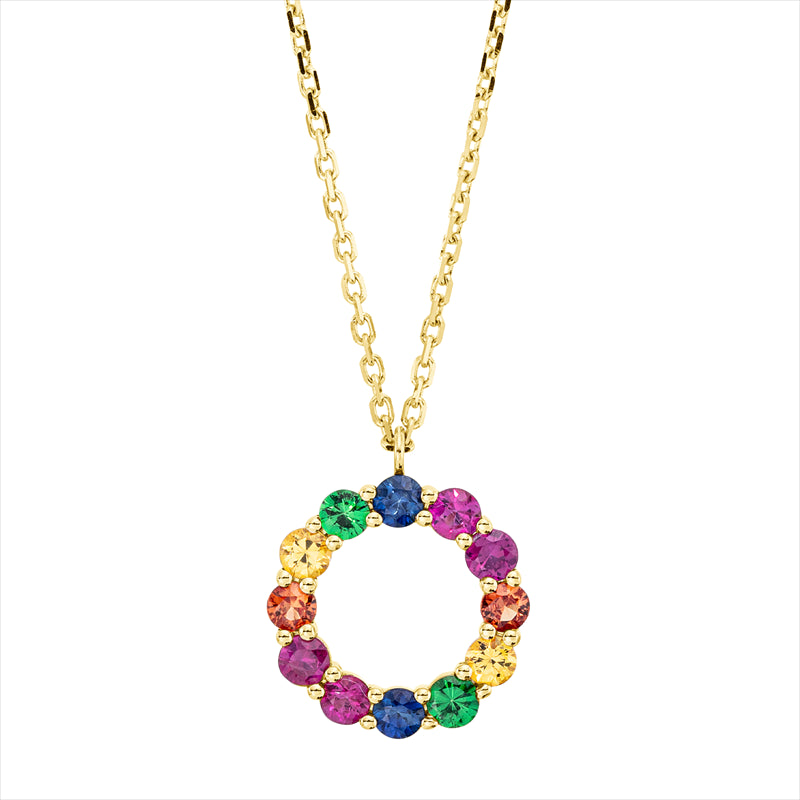 Collier 18 kt GG Kreis. mit ZÖ 40.6 cm . 43.2 cm. 4 Rubine 0.32 ct rot. 2 Saphire 0.12 ct orange. 2 Saphire 0.16 ct blau. 2 Tsavorith 0.15 ct grün. 2 Saphire 0.17 ct gelb. L:45.7 cm