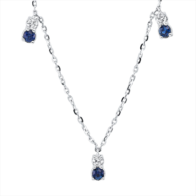 Collier 18 kt WG, mit ZÖ 40 cm + 43 cm, 5 Brill. 0,11 ct, TW-si, 5 Saphire 0,19 ct blau