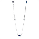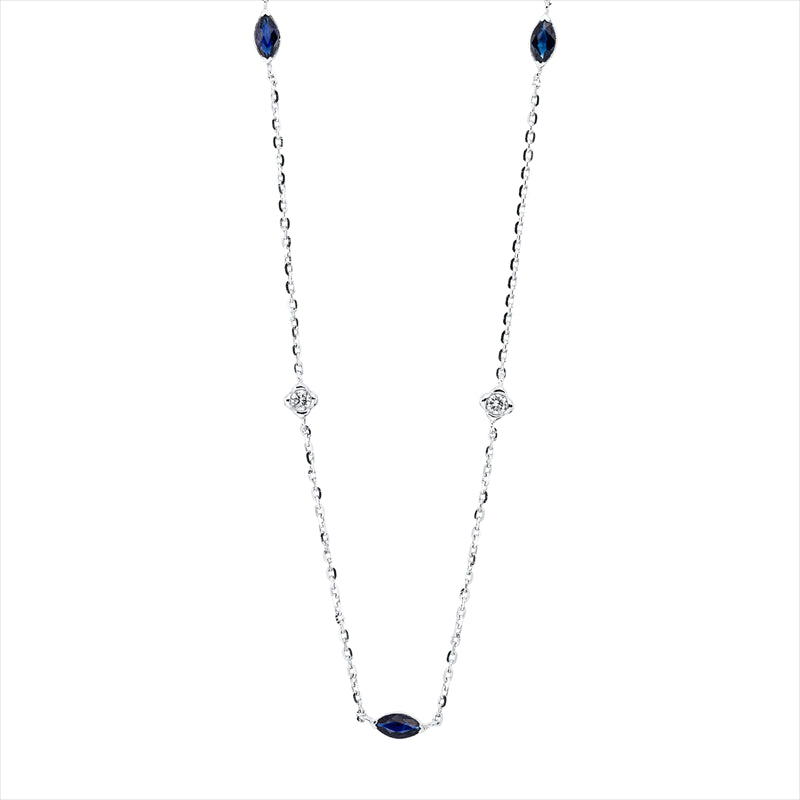 Collier 18 kt WG, mit ZÖ 40 cm + 43 cm, 4 Brill. 0,09 ct, TW-si, 3 Saphire 0,24 ct blau