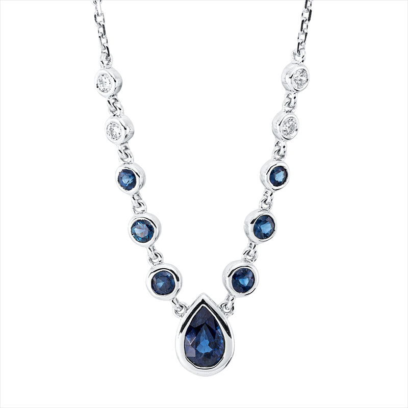 Collier 18 kt WG, 4 Brill. 0,12 ct, TW-si, 1 Saphir 0,52 ct blau, 6 Saphire 0,40 ct blau