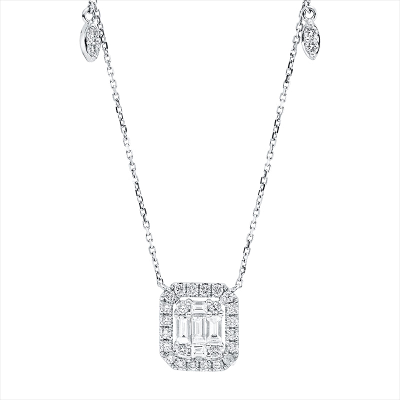 Collier 18 kt WG. 5 Baguette 0.42 ct. TW-vsi/si. 36 Brillanten 0.63 ct. TW-vsi/si. L:40.5 cm