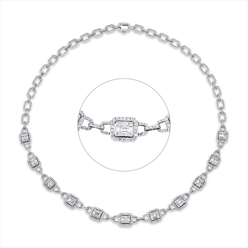Collier 18 kt WG. 55 Baguette 2.43 ct. TW-si. 910 Brillanten 4.17 ct. TW-si. L:40.6 cm