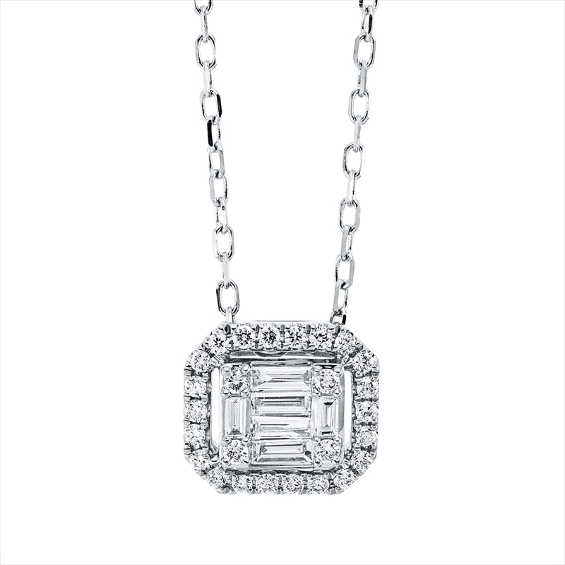 Collier 18 kt WG. 2 Baguette 0.02 ct. TW-si. 4 Baguette 0.10 ct. TW-si. 26 Brillanten 0.13 ct. TW-si. L:45.7 cm