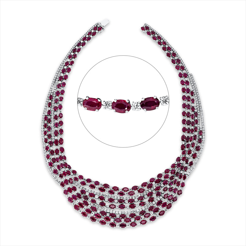 Collier 18 kt WG. 534 Brillanten 27.07 ct. TW-vsi. 228 Rubine 95.92 ct rot. L:43.8 cm
