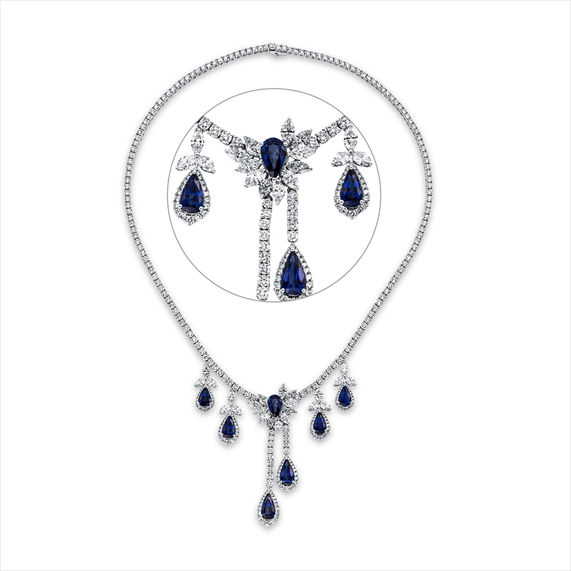 Collier 18 kt WG. 23 Navette 4.51 ct. F-vsi/si. 110 Brillanten 1.03 ct. F-vsi/si. 175 Brillanten 10.29 ct. F-vsi/si. 7 Saphire 10.47 ct blau. L:43.2 cm
