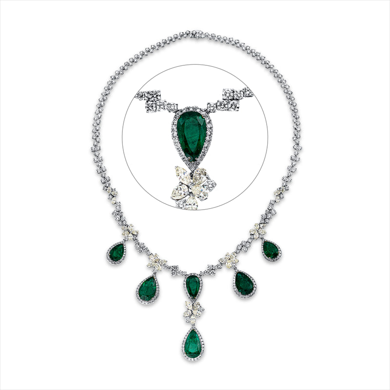 Collier 18 kt WG+GG, 341 Brill.14,65 ct, TW-si, 21 Tropf 4,38 ct, gelb, 10 Nav. 2,00 ct, gelb, 6 Sm. 26,33 ct grün