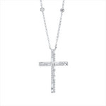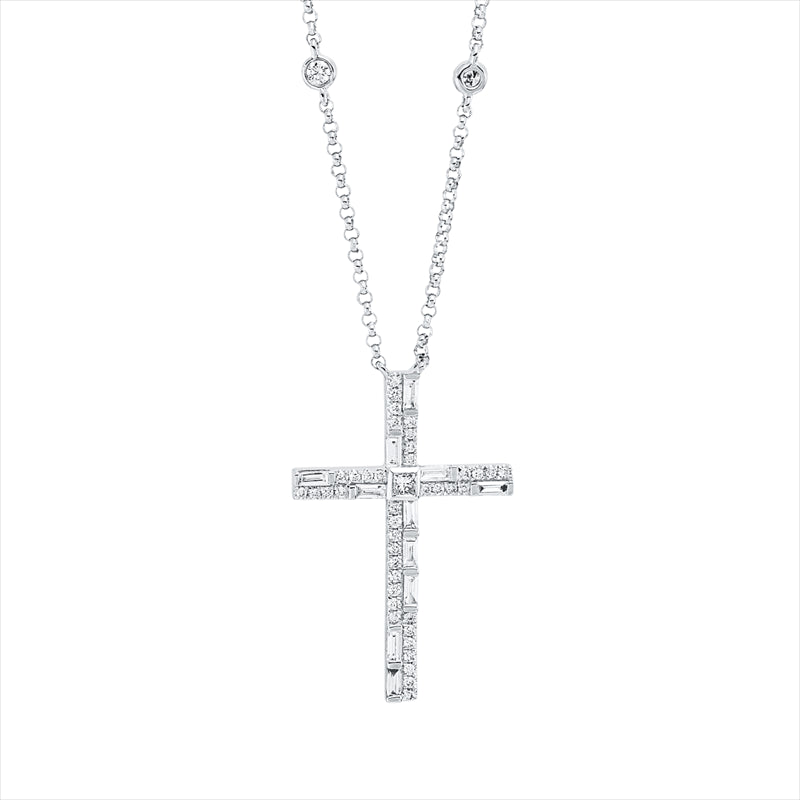 Collier 18 kt WG Kreuz. mit ZÖ 40 & 43 cm. 4 Brillanten 0.09 ct. TW-si. 1 Princ. 0.03 ct. F-vsi/si. 11 Baguette 0.19 ct. F-vsi/si. 40 Brillanten 0.11 ct. TW-si. H:24.5 mm. B:16.0 mm. L:45.7 cm. S:1.9 mm