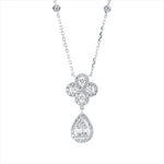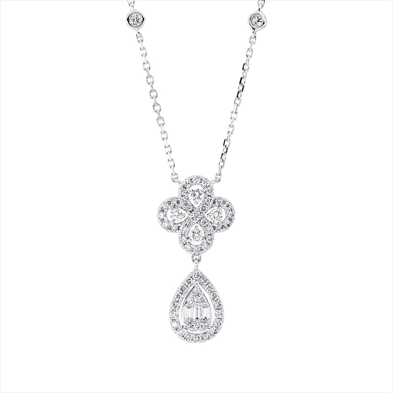 Collier 18 kt WG Tropfen. mit ZÖ 40 cm + 43 cm. 3 Baguette 0.08 ct. F-vsi/si. 61 Brillanten 0.64 ct. TW-si. L:45.7 cm