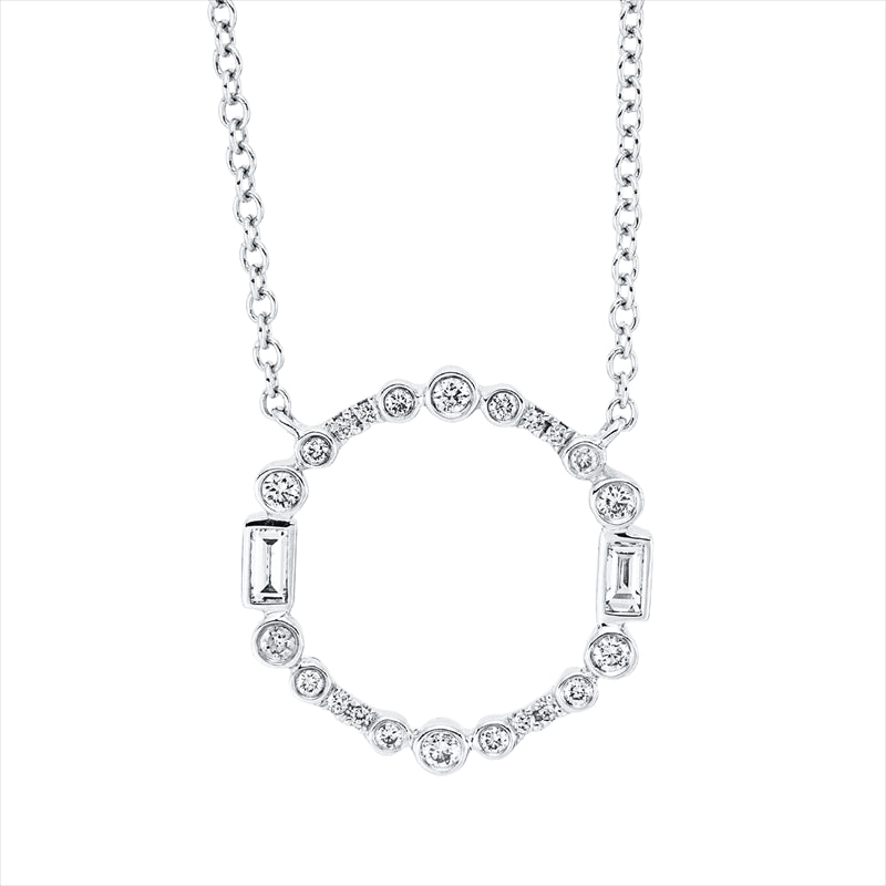 Collier 18 kt WG Kreis. mit ZÖ 41 cm + 43 cm. 2 Baguette 0.10 ct. TW-si. 22 Brillanten 0.15 ct. TW-si. L:46.0 cm