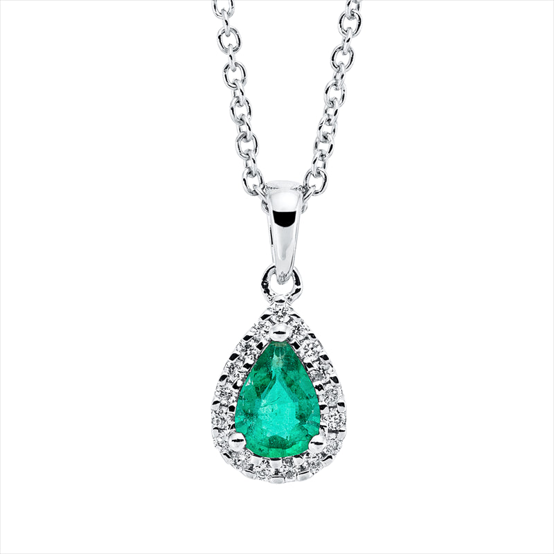 Collier 18 kt WG. mit ZÖ 40 cm. 17 Brillanten 0.09 ct. TW-si. 1 Smaragd 0.30 ct grün. H:14.5 mm. B:6.3 mm. L:45.0 cm. S:4.4 mm