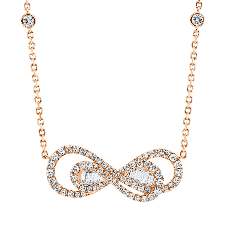 Collier 18 kt RG, mit ZÖ 40 cm, 43 cm, 40 Brill. 0,54 ct, 31 Brill. 0,16 ct, TW-si, 8 Bag. 0,21 ct, F-vsi/si